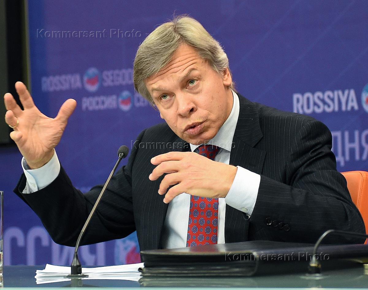 Председатель комитета Государственной думы России по международным делам Алексей Пушков во время пресс-конференции в МИА "Россия сегодня".