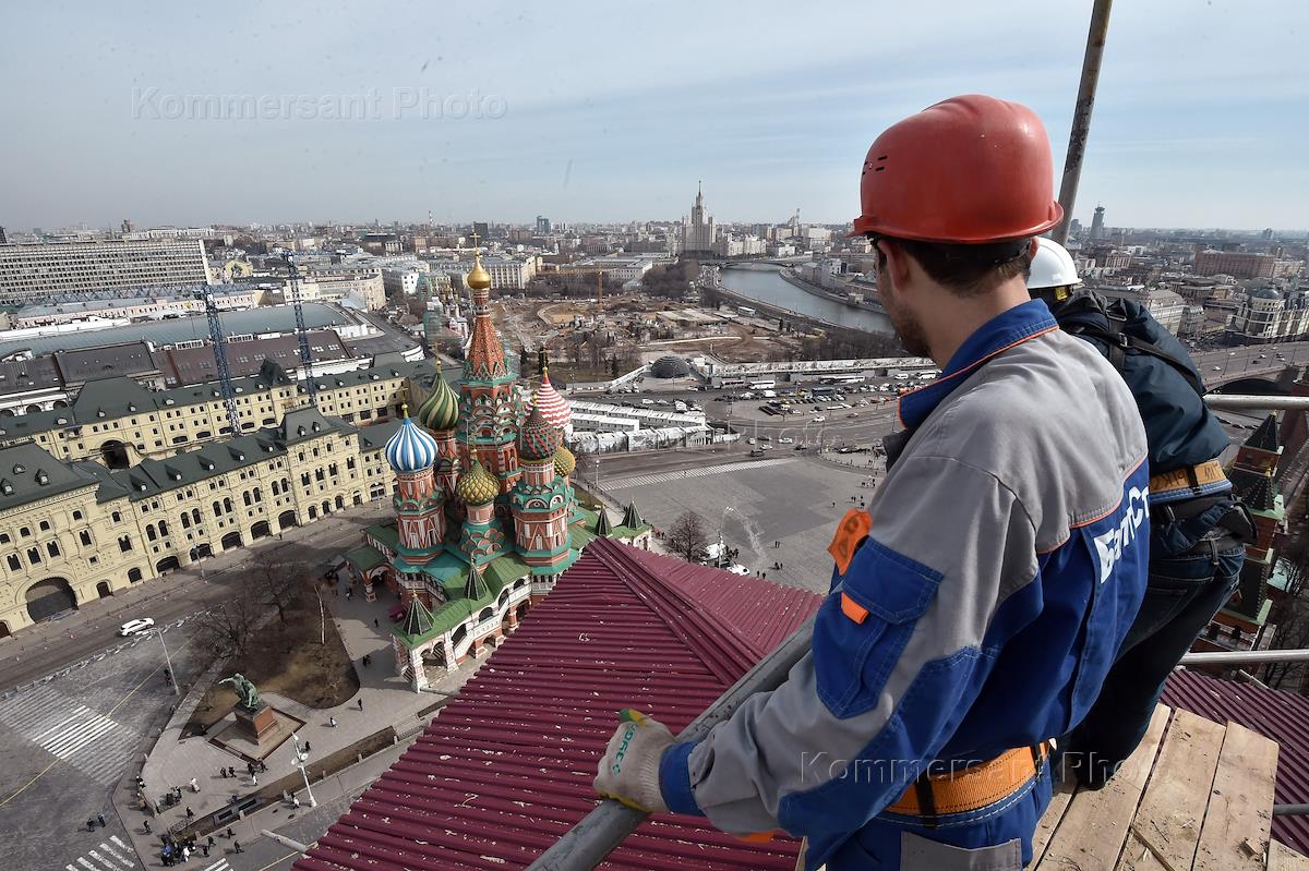 Жанровая фотография. Виды Москвы со строительных лесов Спасской башни Кремля. Уборка трибун для гостей на парадах на Красная площадь.