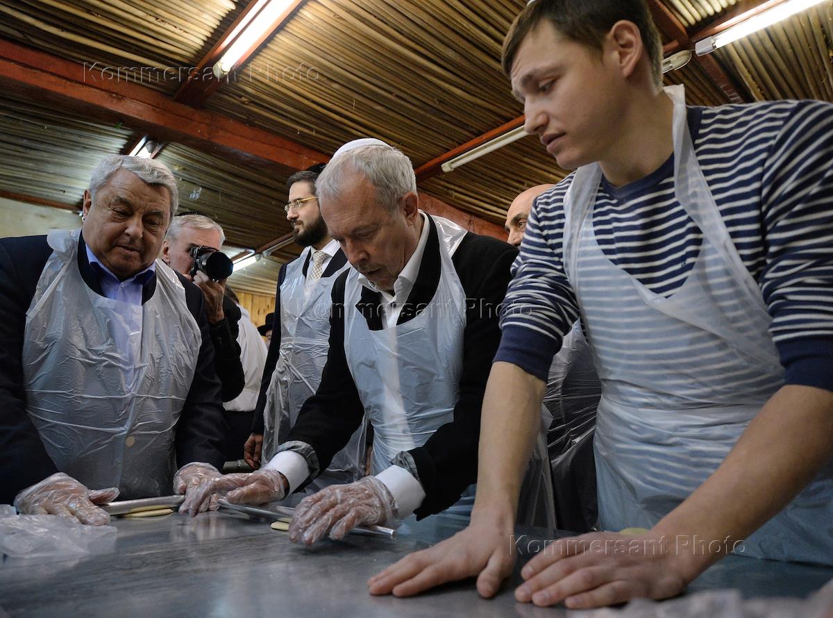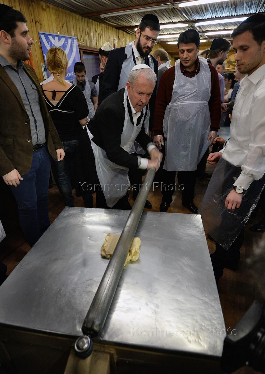 Председатель совета директоров инвестиционной группы "Открытие" Борис Минц (слева) во время торжественной церемонии выпекания кошерной мацы, в рамках празднования Песаха в мацепекарне ешивы "Огалей Яаков".