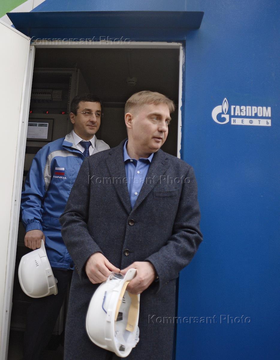 Презентация постов автоматизированной системы мониторинга воздуха прошла на территории предприятия ОАО "Газпромнефть-МНПЗ". Генеральный директор ОАО "Газпромнефть-МНПЗ" Аркадий Егизарьян (слева) и руководитель департамента природопользования и охраны окружающей среды Москвы Антон Кульбачевский (справа) во время презентации.