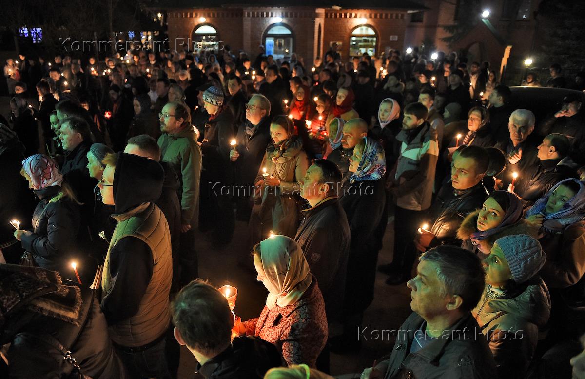 Крестный ход, пасхальная заутреня и Божественная литургия. Верующие во время праздничной пасхальной службы.