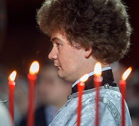 Крестный ход, пасхальная заутреня и Божественная литургия в кафедральном соборном Храме Христа Спасителя. Президент Российской ассоциации байкеров Александр Залдостанов (Хирург) (слева) и супруга уполномоченного при президенте России по правам ребенка Павла Астахова Светлана (справа) на праздничном пасхальном богослужении в храме Христа Спасителя.