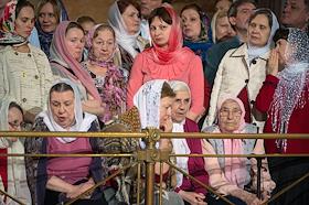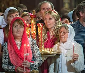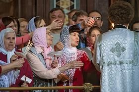 Крестный ход, пасхальная заутреня и Божественная литургия в кафедральном соборном Храме Христа Спасителя. Верующие на праздничнм пасхальном богослужении в храме Христа Спасителя.