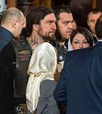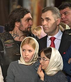 Крестный ход, пасхальная заутреня и Божественная литургия в кафедральном соборном Храме Христа Спасителя. Президент Российской ассоциации байкеров Александр Залдостанов (Хирург) (слева) и уполномоченный при президенте России по правам ребенка Павел Астахов (в центре) на праздничном пасхальном богослужении в храме Христа Спасителя.