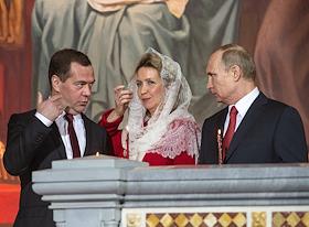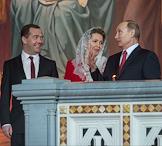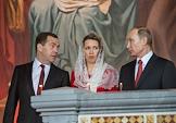 Крестный ход, пасхальная заутреня и Божественная литургия в кафедральном соборном Храме Христа Спасителя. Слева направо: председатель правительства России Дмитрий Медведев с супругой Светланой Медведевой и президент России Владимир Путин на праздничном пасхальном богослужении в храме Христа Спасителя.