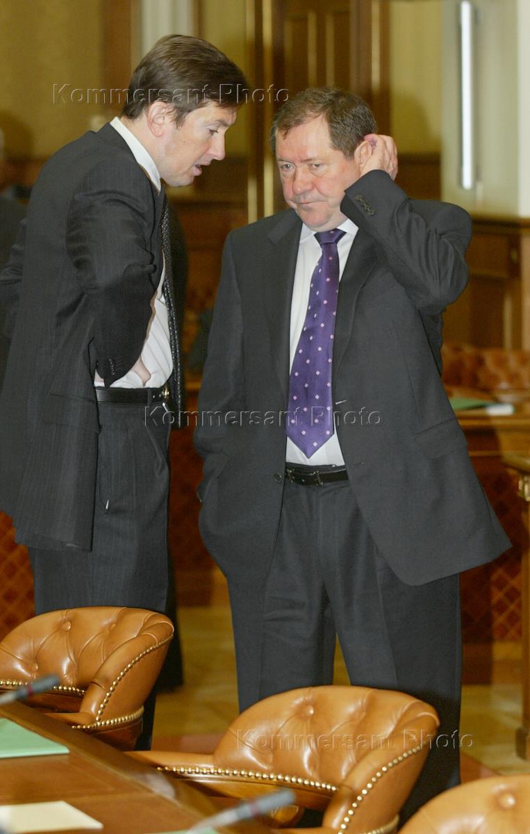 Russian Communications and Information Minister Leonid Reyman (left) talks to Atomic Energy Minister Alexander Rumyantsev (right) at a government meeting.