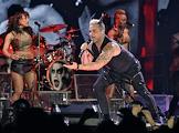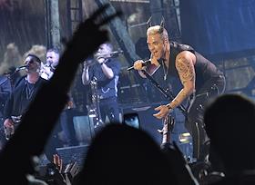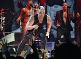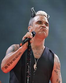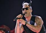 Певец Робби Уильямс во время выступления на своем сольном концерте в спортивном комплексе "Олимийский".