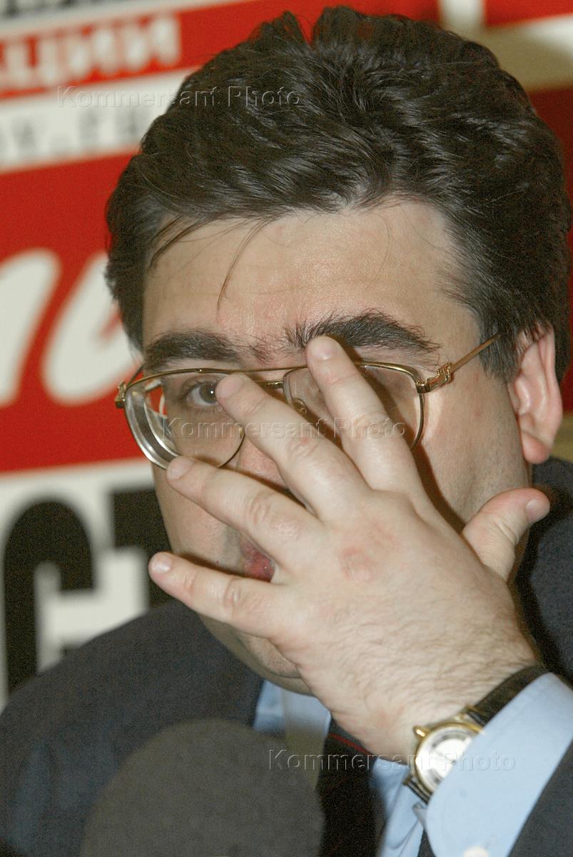 Member of the State Duma Liberal Democratic Party (LDPR) Alexey Mitrofanov is interviewed at the news conference headlined 'Russian Role in US-Iraqi War. Presentation of the Patriotic Song Dedicated to US President Bush as Peformed by LDPR Leader Vladimir Zhirinovsky'. The news conference was held in the Mir-Novostey press centre.