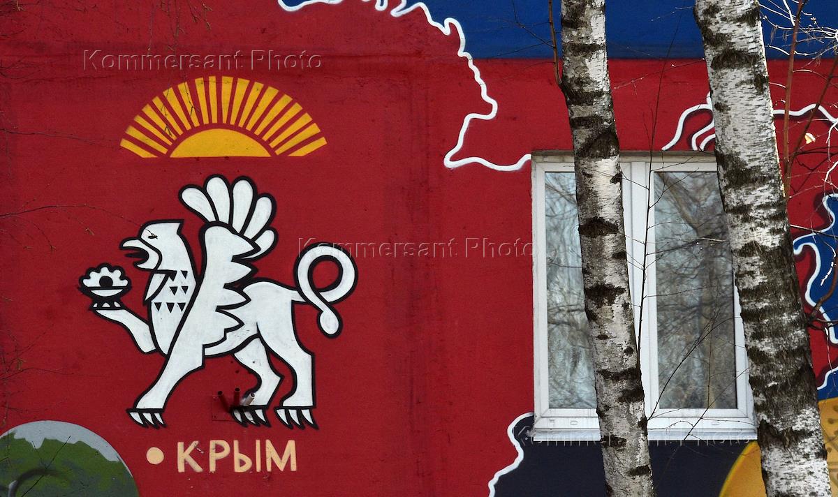 Жанровая фотография. Граффити на фасаде жилого дома с изображением герба Республики Крым и символа российского рубля.