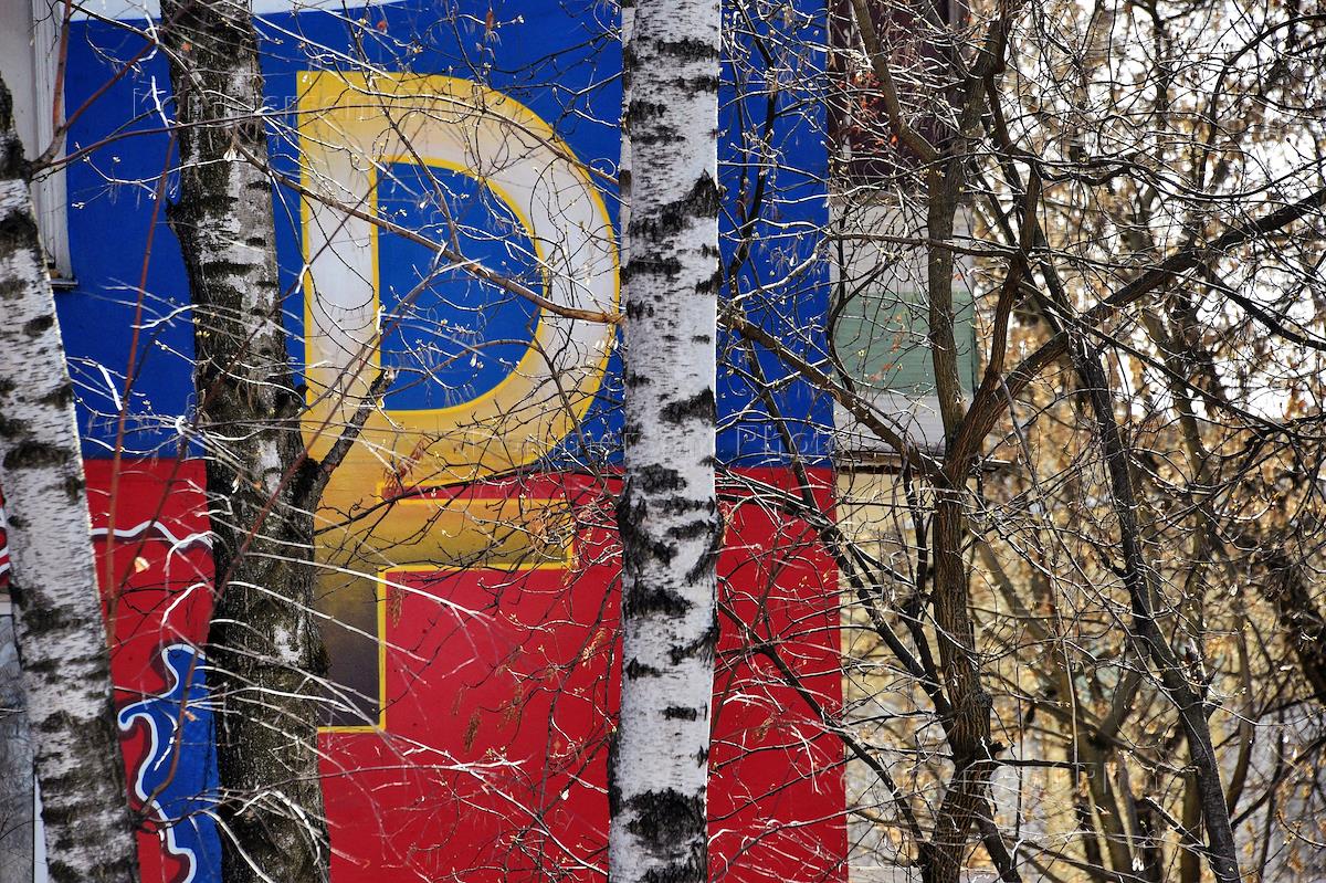 Жанровая фотография. Граффити на фасаде жилого дома с изображением символа российского рубля.
