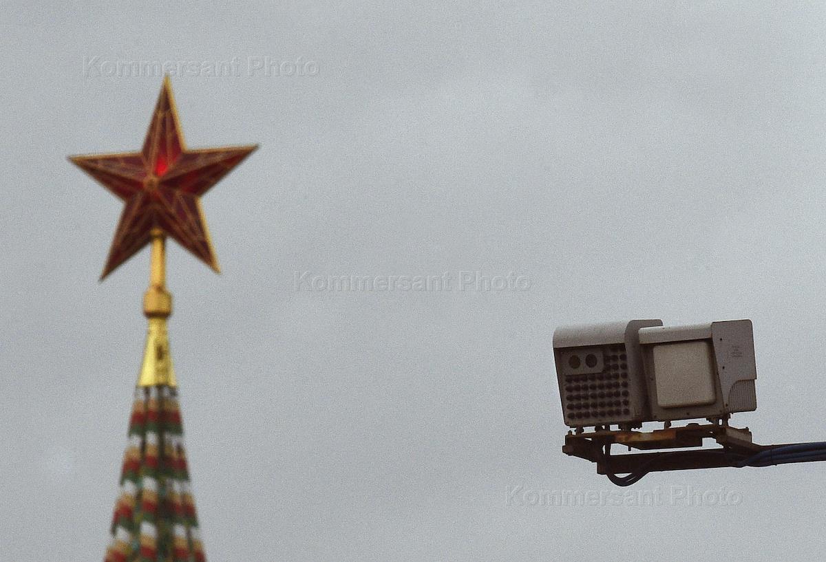 Виды Москвы. Спасская башня Московского Кремля во время реконструкции и камера фото- и видеофиксации нарушений правил дорожного движения.
