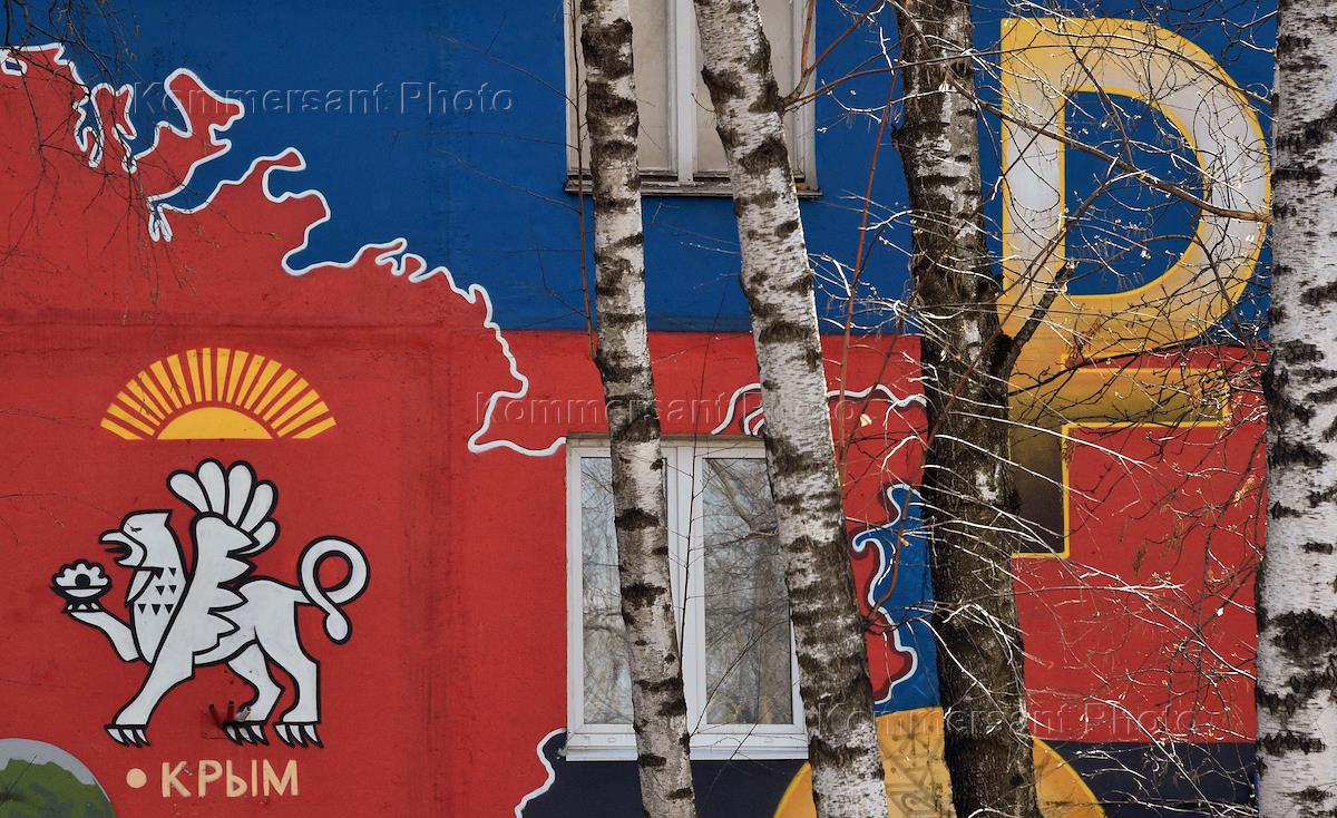 Жанровая фотография. Граффити на фасаде жилого дома с изображением герба Республики Крым и символа российского рубля.