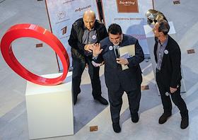 XV юбилейный открытый фестиваль искусств "Черешневый лес". Слева направо: скульптор Георгий Франгулян, председатель наблюдательного совета группы компаний Bosco di Ciliegi Михаил Куснирович и скульптор Прасто (Важа Микаберидзе) на церемонии открытия выставки "Эквилибриум" современного грузинско-итальянсого скульптора Важи Микаберидзе (Прасто) в галерее "Bosco Петровский Пассаж".