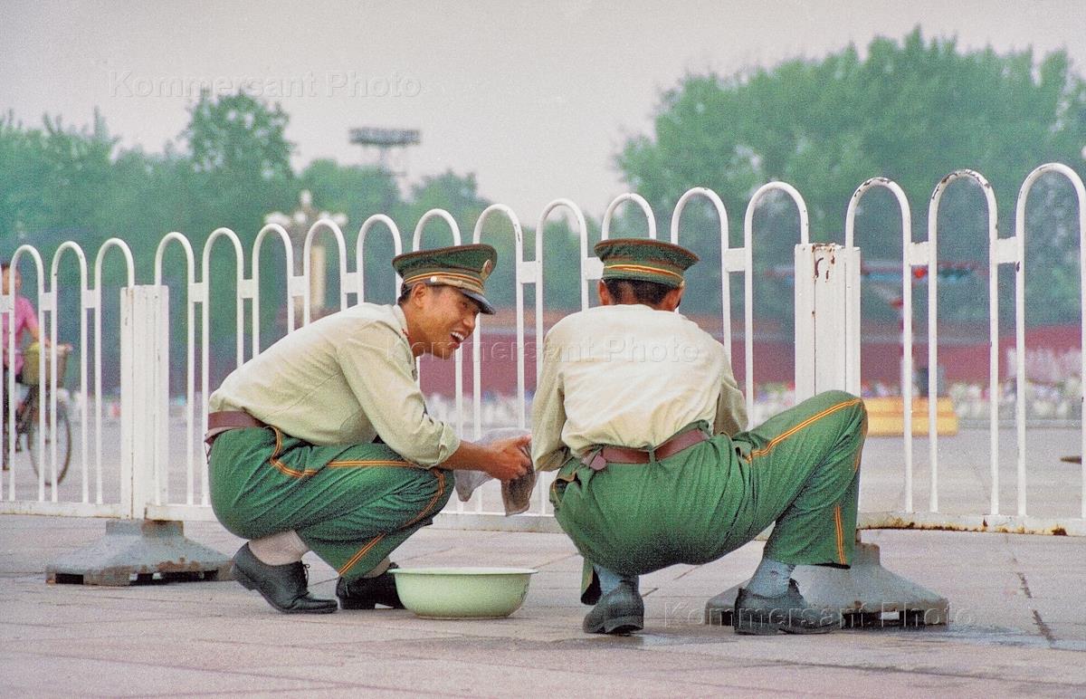 Жанровая фотография. Военнослужащие моют железный забор ограждения на площади.