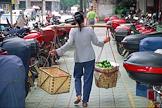 Жанровая фотография. Девушка на коромысле несет коробки с фруктами по улице с припаркованными мотороллерами.