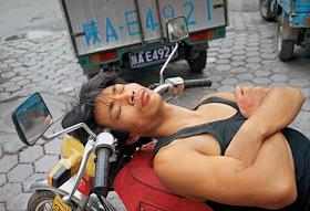 Жанровая фотография. Мужчина спит на руле мотоцикла.