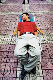 Жанровая фотография. Мужчина спит в шезлонге на улице.