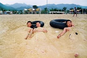 Жанровая фотография. Мужчины загорают в песке на пляже.