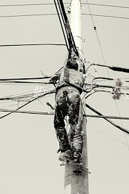Жанровая фотография. Виды Китая. Мужчина электрик во время работы на столбе.