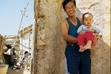 Жанровая фотография. Виды Китая. Мужчина держит ребенка на руках у старого глинобитного дома.