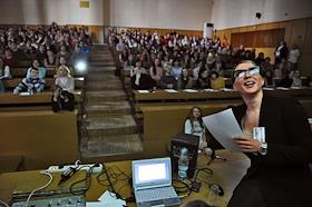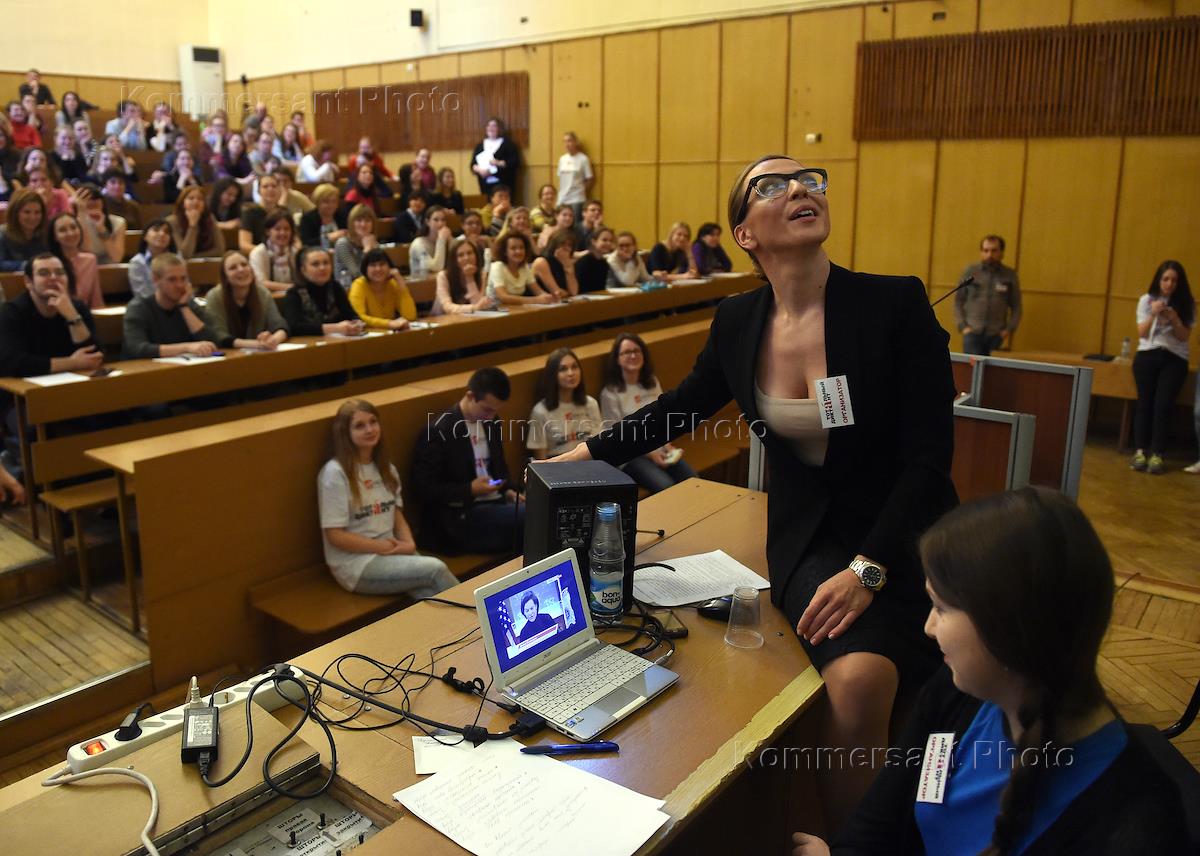 Участники глобальной образоватльной акции "Тотальный диктант-2015" на факультете журналистики в Московском Государственной университете (МГУ) имени М.В.Ломоносова. Телеведущая Яна Чурикова (слева) читает текст диктанта.