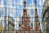 Жанровая фотография. Отражение православного храма в стекле офисного центра.