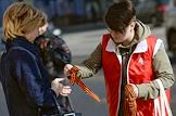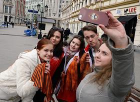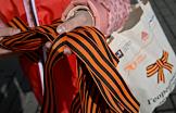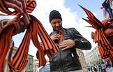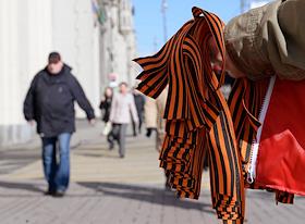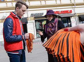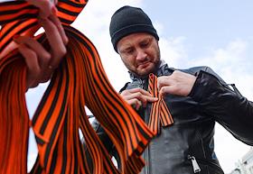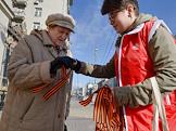 Волонтеры раздают георгиевские ленточки во время патриотической акции "Георгиевская ленточка", посвященной 70-й годовщине победы в Великой Отечественной войне.