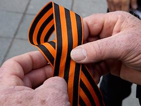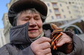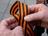 Георгиевская ленточка в руках пожилой женщины, полученная от волонтеров во время патриотической акции "Георгиевская ленточка", посвященной 70-й годовщине победы в Великой Отечественной войне.