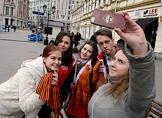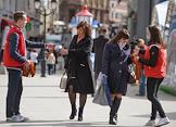 Волонтеры у памятника Юрию Долгорукому раздают георгиевские ленточки во время патриотической акции "Георгиевская ленточка", посвященной 70-й годовщине победы в Великой Отечественной войне.