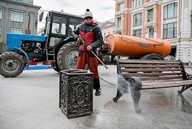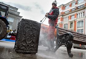 Жанровая фотография. Работник коммунальной службы во время мойки скамейки.