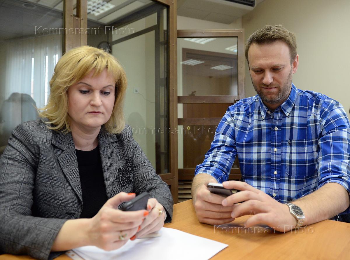 Адвокат Ольга Михайлова (слева) и председатель партии "Партия прогресса" Алексей Навальный (справа) на заседании Люблинского районного суда. Суд принял к производству документ ФСИН, в котором служба просит изменить Навальному условное наказание на реальное по приговору Кировского областного суда.
