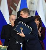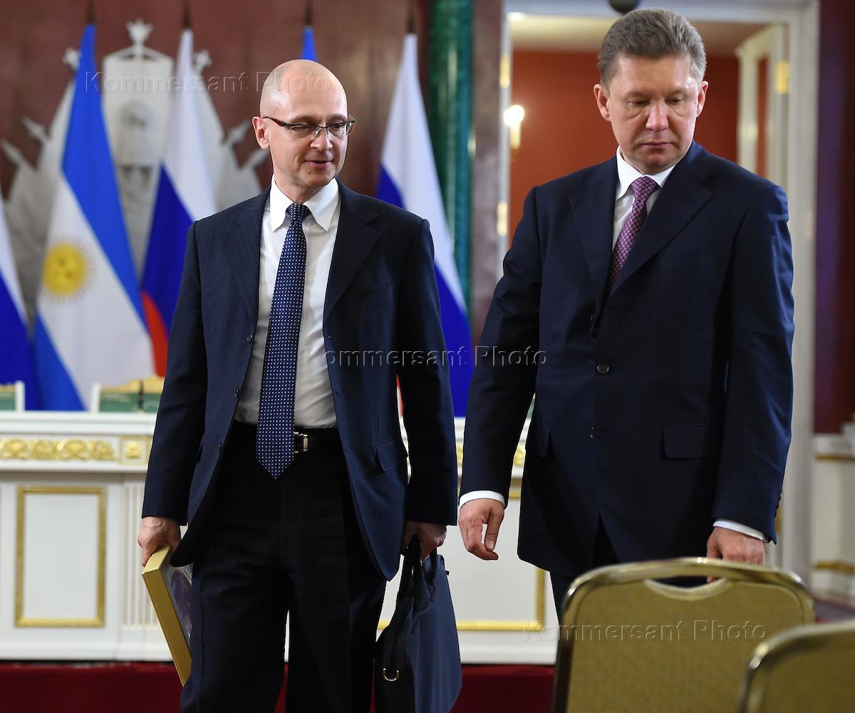 Генеральный директор госкорпорации "Росатом" Сергей Кириенко (слева) и председатель правления ОАО "Газпром" Алексей Миллер (справа) на церемонии подписания совместных документов по итогам переговоров президента Аргентины Кристины Фернандес де Киршнер и президента России Владимира Путина в Кремле.