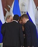 Президент России Владимир Путин (слева) и президент Аргентины Кристина Фернандес де Киршнер (вторая справа)во время церемонии подписания совместных документов по итогам российско-аргентинских переговоров в Кремле.