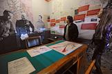 Посетительница на выставке "Метро и война" и "Искусство победителей" в Музее Декоративно-прикладных искусств. Скульптура И. Сталина.
