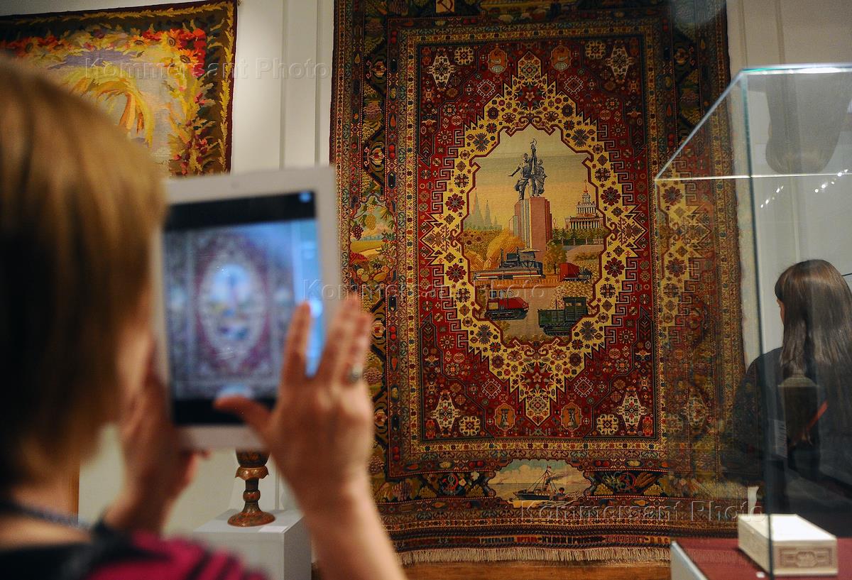 Посетительница на выставке "Метро и война" и "Искусство победителей" в Музее Декоративно-прикладных искусств. Скульптура И. Сталина.