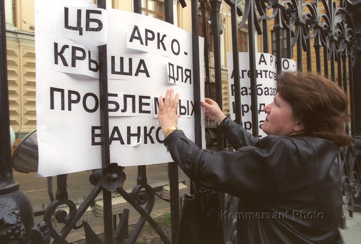 Cheated investors held a picket at the main office of the "Russian Credit" commercial bank. A banner "CB, ARCO - roof (krysha)...".
