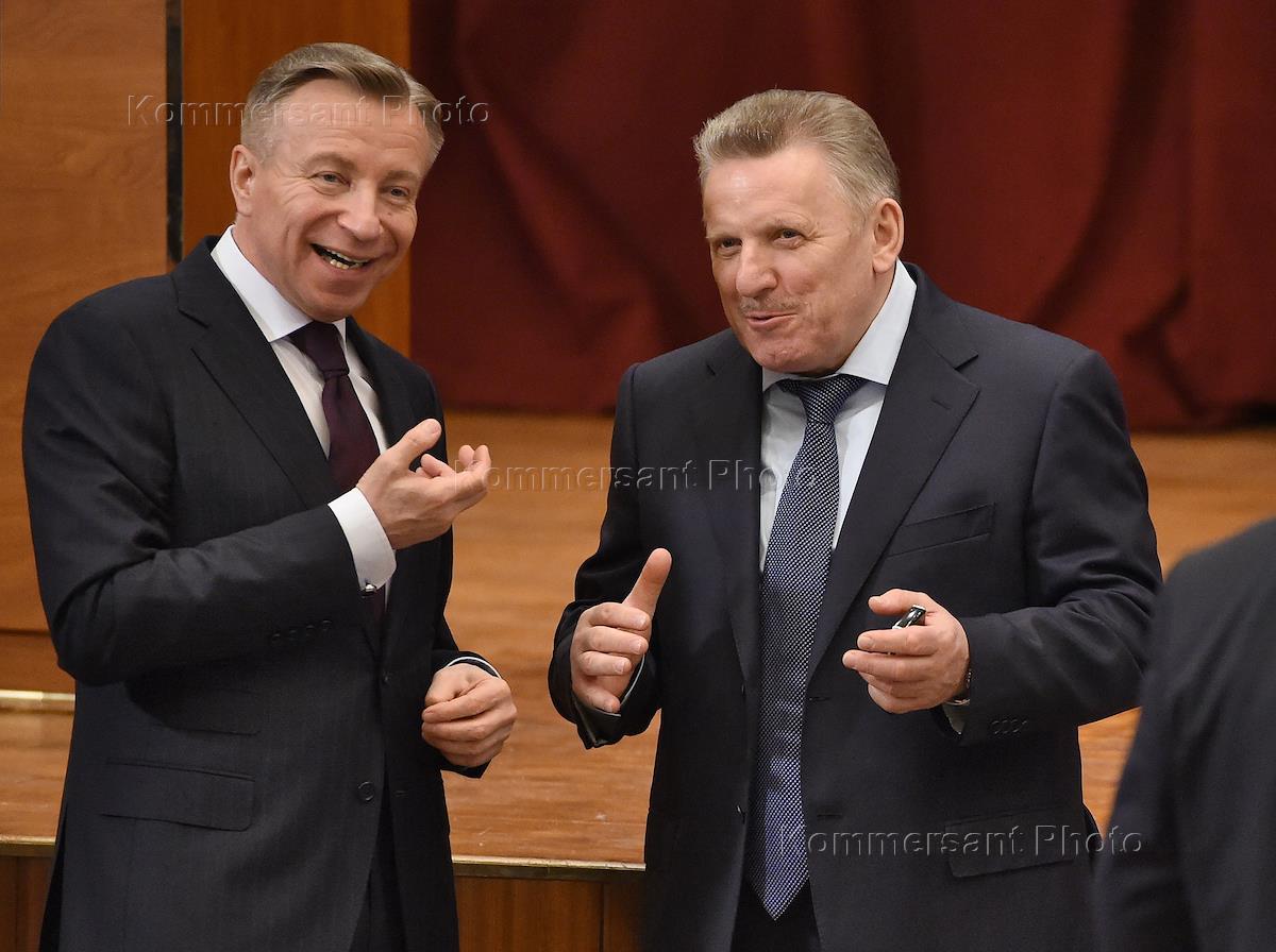 Представитель в Совете Федерации России от исполнительного органа государственной власти Ростовской области Евгений Бушмин (слева) и президент Российского союза промышленников и предпринимателей (РСПП) Александр Шохин (справа) перед началом заседания коллегии Министерства экономического развития России.