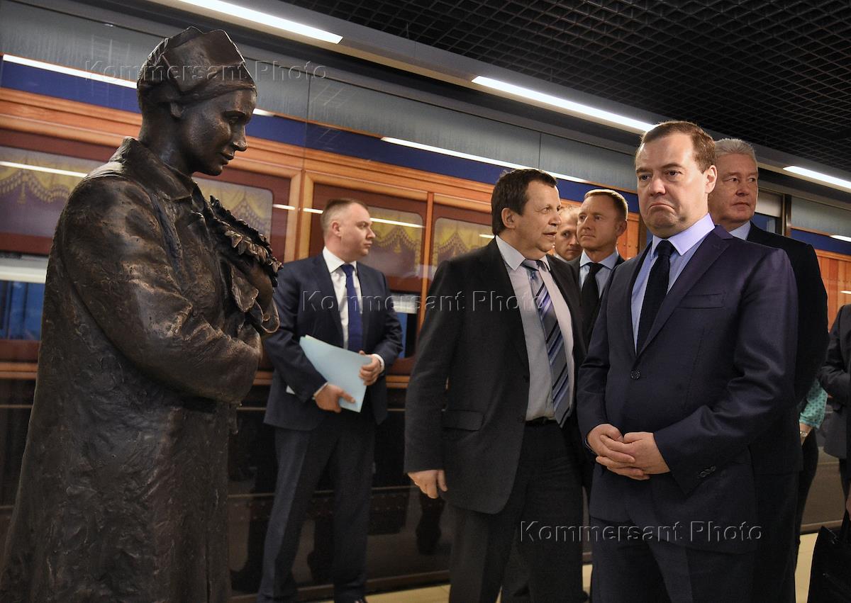 Слева направо: председатель правительства России Дмитрий Медведев, мэр Москвы Сергей Собянин и заместитель председателя правительства России Ольга Голодец во время посещения детского города мастеров "Мастерславль".