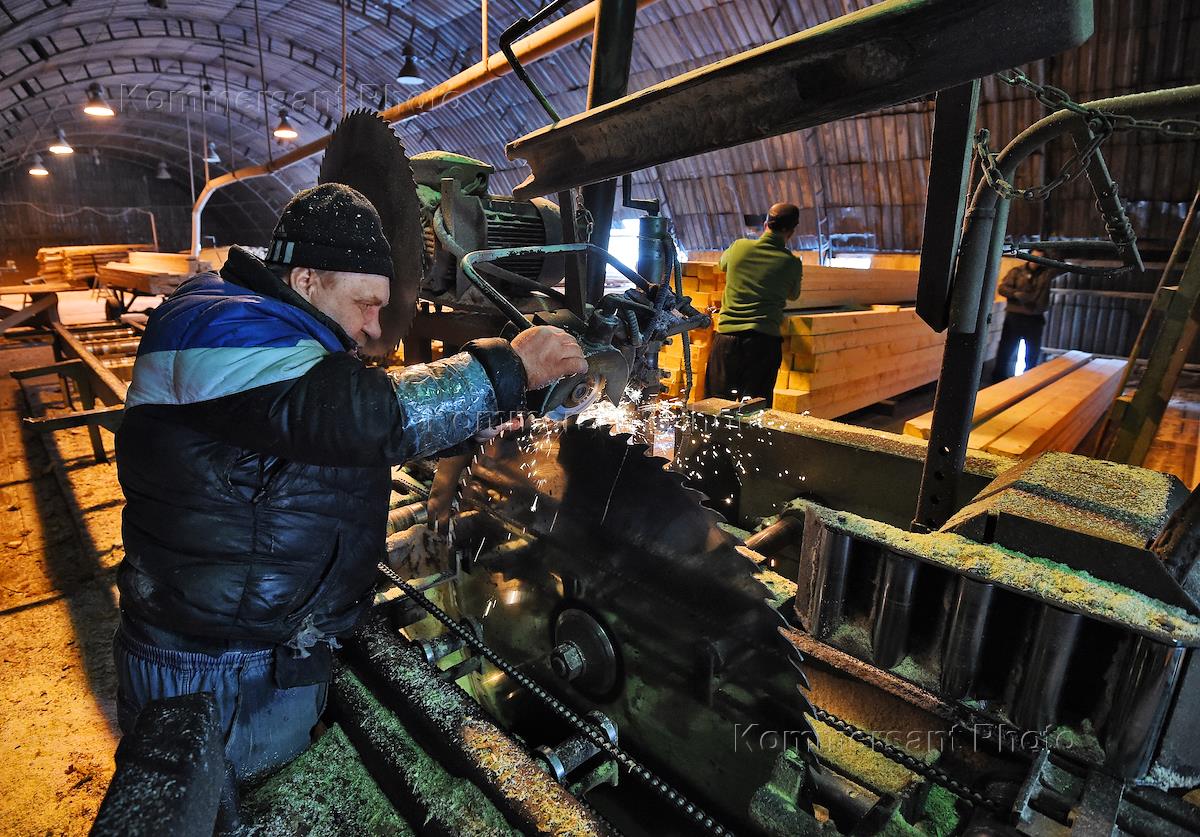 Рабочие пилорамы в поселке Сосьва Серовского района во время работы.