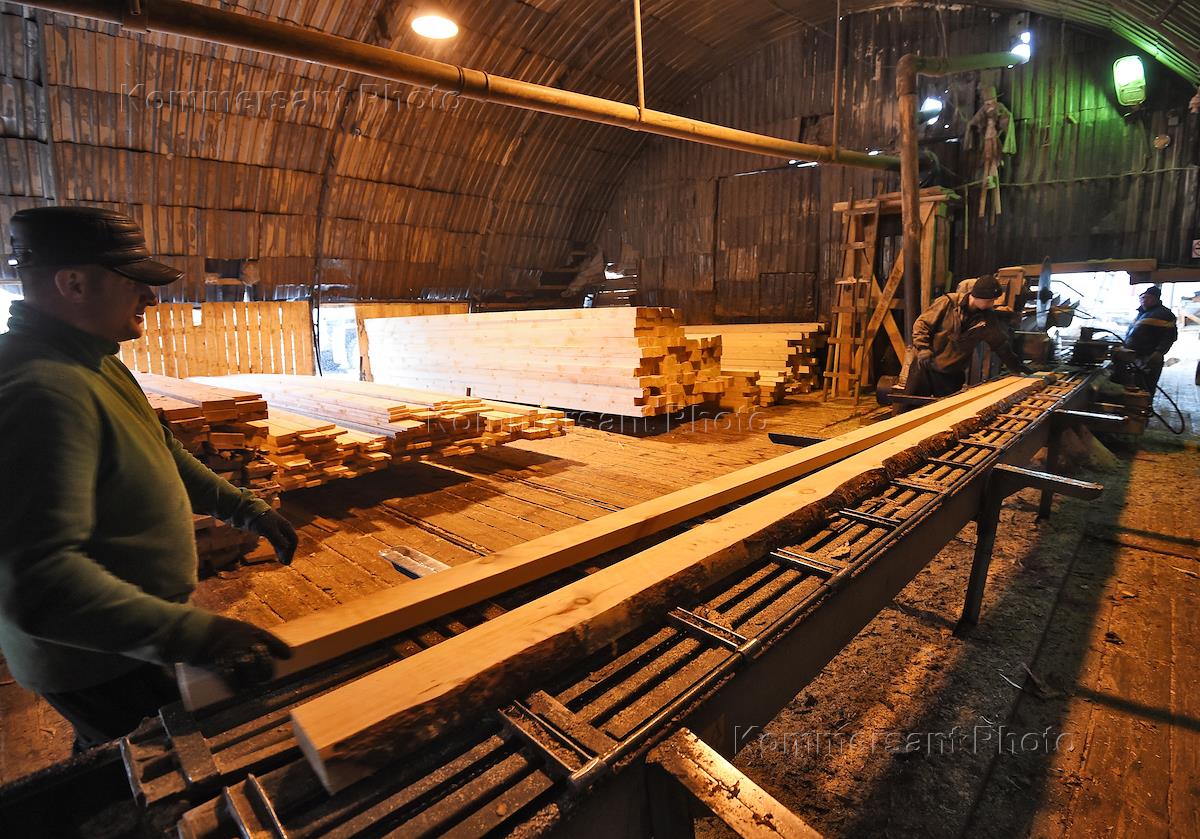 Рабочие пилорамы в поселке Сосьва Серовского района во время работы.