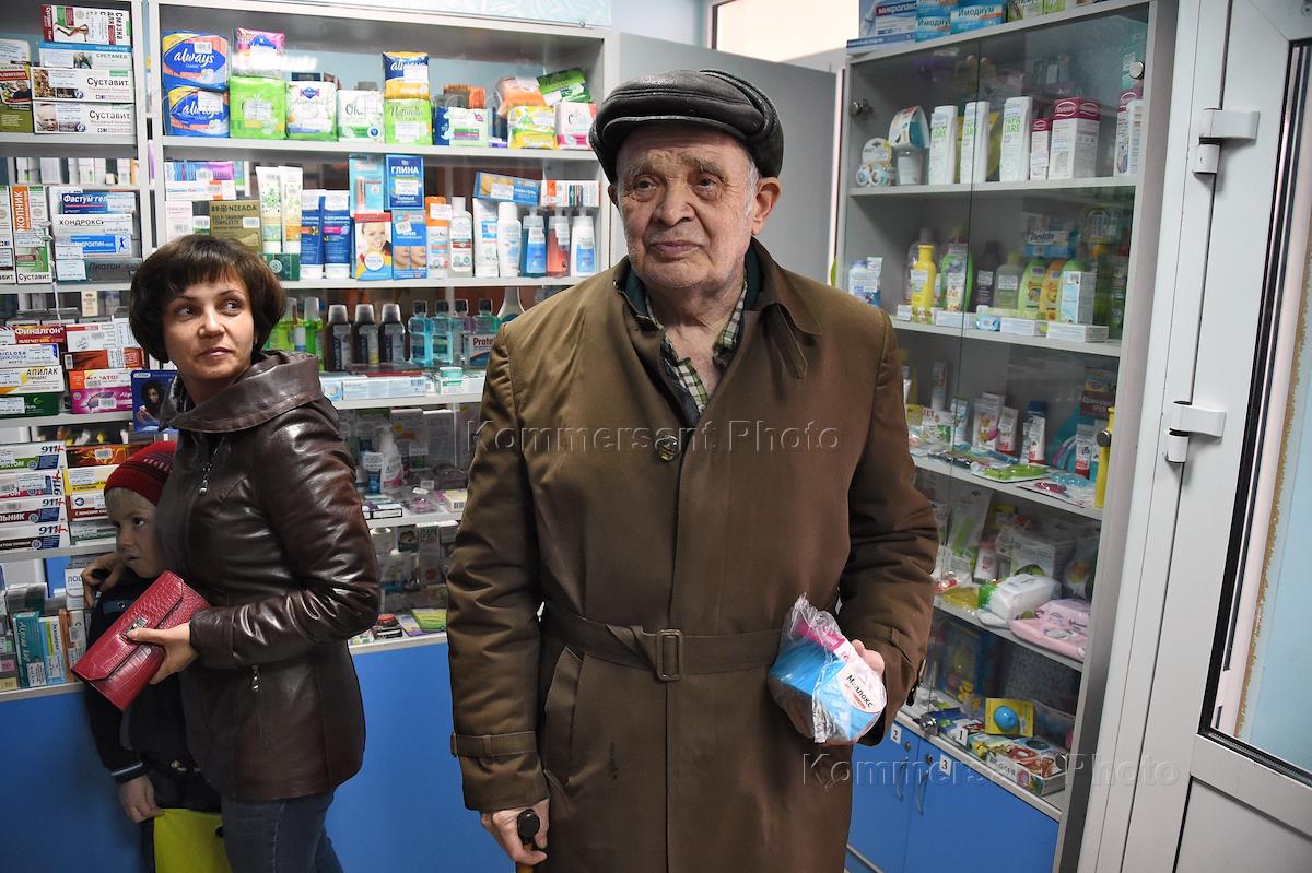 Жанровая фотография. Пожилой человек в аптеке поселка Сосьва Серовского района. Теминал по оплате платежей.