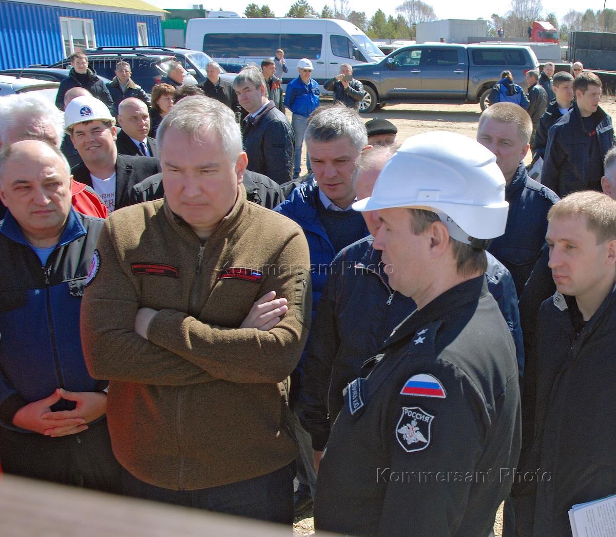 Заместитель председателя правительства России Дмитрий Рогозин (в центре) во время ознакомления с ходом работ строящегося города Циолковский рядом с космодромом "Восточный".