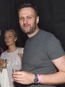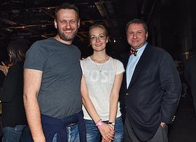 Председатель партии "Партия прогресса" Алексей Навальный (слева) с супругой Юлией и радиоведущий "Коммерсанть FM" Константин Эггерт (справа) на праздновании Дня рождения телеканала "Дождь" в Stadium Live.