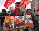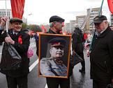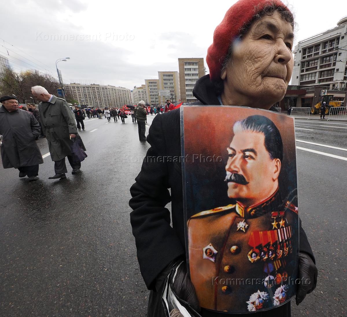 Участница шествия и митинга Коммунистической партии России в День международной солидарности трудящихся с портретом И. Сталина.