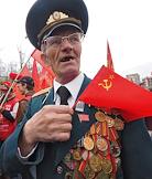 Ветеран ВОВ и участники митинга Коммунистической партии России в День международной солидарности трудящихся во время шествия.