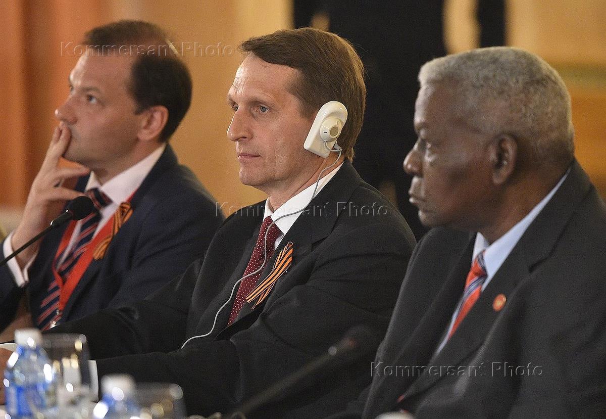 Рабочий визит председателя Государственной думы России Сергея Нарышкина в Республику Куба. Председатель Государственной думы России Сергей Нарышкин (в центре) во время встречи с членом Политбюро ЦК компартии Кубы, председателем Национальной ассамблеи народной власти республики Эстебаном Ласо Эрнандесом (cправа).