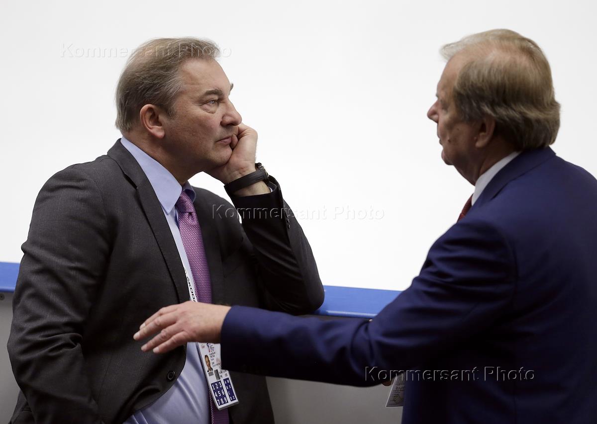 Президент федерации хоккея России (ФХР) Владислав Третьяк (слева) перед официальным фотографированием сборной для международной федерации хоккея на льду (IIHF).