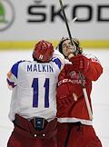 Чемпионат мира по хоккею. Групповой этап. Матч между сборными командами России и Дании. Хоккеист Евгений Малкин (слева) во время матча.