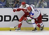 Чемпионат мира по хоккею. Групповой этап. Матч между сборными командами России и Дании. Хоккеисты Ким Столь (слева) и Сергей Широков (справа) во время матча.