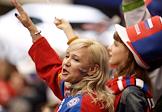 Чемпионат мира по хоккею. Групповой этап. Матч между сборными командами России и Дании. Российские болельщики на трибуне во время матча.